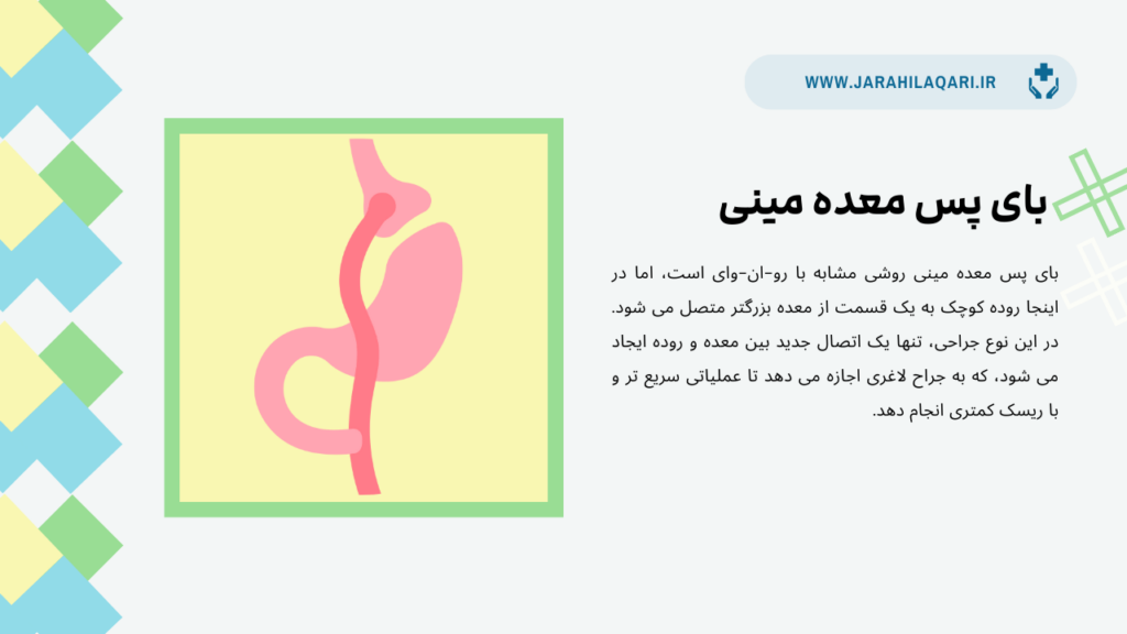 بای پس معده مینی روشی مشابه با رو-ان-وای است، اما در اینجا روده کوچک به یک قسمت از معده بزرگتر متصل می شود. در این نوع جراحی، تنها یک اتصال جدید بین معده و روده ایجاد می شود، که به جراح لاغری اجازه می دهد تا عملیاتی سریع تر و با ریسک کمتری انجام دهد.